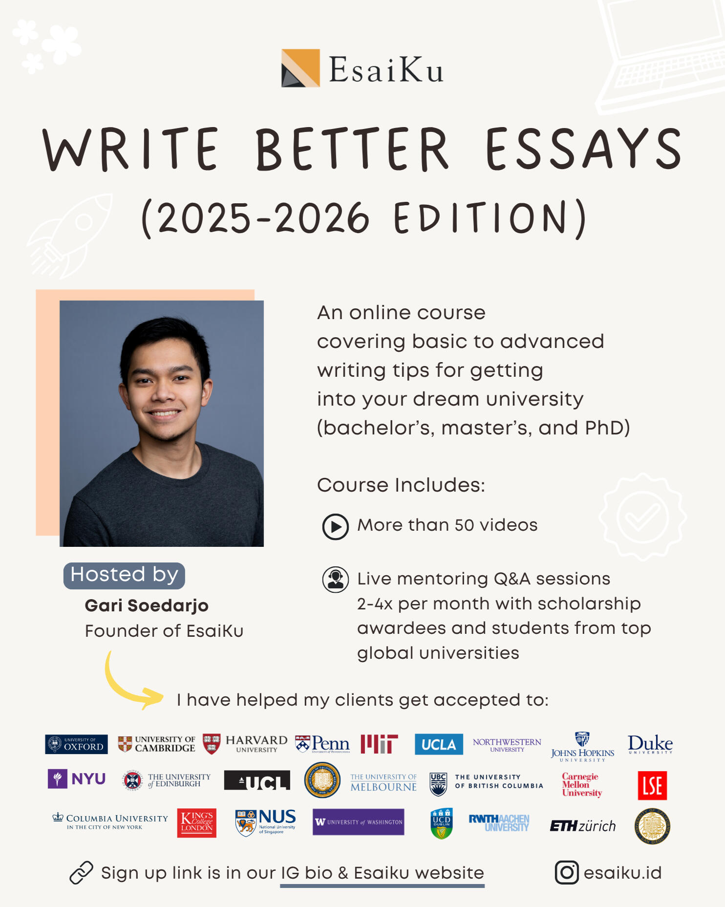 If you want to get into your dream university or get the scholarship to afford it, you will need to write solid essays. But that's not easy—it takes a lot of thinking. This course will give you all of the advice that you need in the shortest amount of time.I mean... admissions cycles are already short, so don’t waste time trying to figure it out on your own.This course is the culmination of reading hundreds of essays, review calls with hundreds of applicants, and hosting almost a dozen webinars on the same topic.Perfect for US & UK master's and PhD applicants, but overall, I believe it will still be useful for anyone looking to improve their writing skills—whether you're a scholarship applicant, high school student, or applying to universities outside the US and UK. I guarantee that you will all find immense value in this course.For the live mentoring Q&A Session (group call via Zoom), my goal is to invite 1 special guest during each session (Master's, PhD, LPDP Awardees). I’m aiming to get a mix of everyone: MBAs, LLMs, engineers, PhDs, education master's, public policy/administration, analytics master's, and more. And not just from the US & UK, but people from other countries too. These live sessions will be during the peak season of September 2025-January 2026 and will be recorded. Stay tuned for more details.Language of instruction: Bahasa Indonesia for Master's & PhD lessons and English for undergraduate lessons.Price: Rp9,000,000 Rp399,000